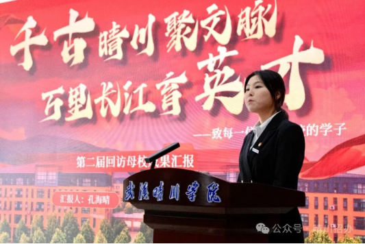 孔海晴同学的汇报主题为《千古晴川聚文脉,万里长江育英才》,立足历史长河与地域文化,深情回溯晴川积淀的文脉底蕴,彰显长江之畔育人沃土所孕育的时代新气象。